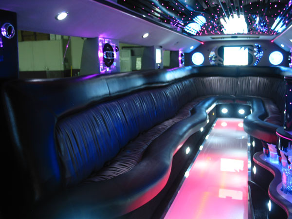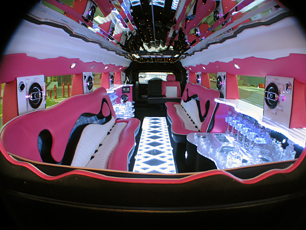 Features: TV/Video, CD player, privacy divider, custom lighting, moon-roof, intercom and well bar.